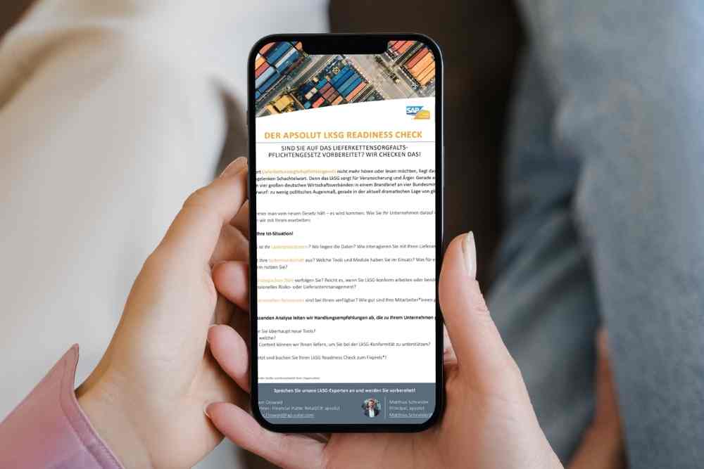 Wir, die apsolut Group, unterstützen Sie gerne dabei die LkSG-Maßnahmen und Pflichten in Ihrem SAP-System umzusetzen.